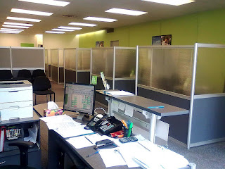 Вот так выглядит мой офис. Это вид от входной двери. Слева находится стол администратора, где происходит регистрация клиентов, плата услуг, прием звонков и пр. А сразу за этим столом находится место ожидания клиентов. Помните, я писала, как мне приходится тяжело, вызывая нового клиента, когда я боюсь неправильно произнести его имя? Вон там это все и происходит:)