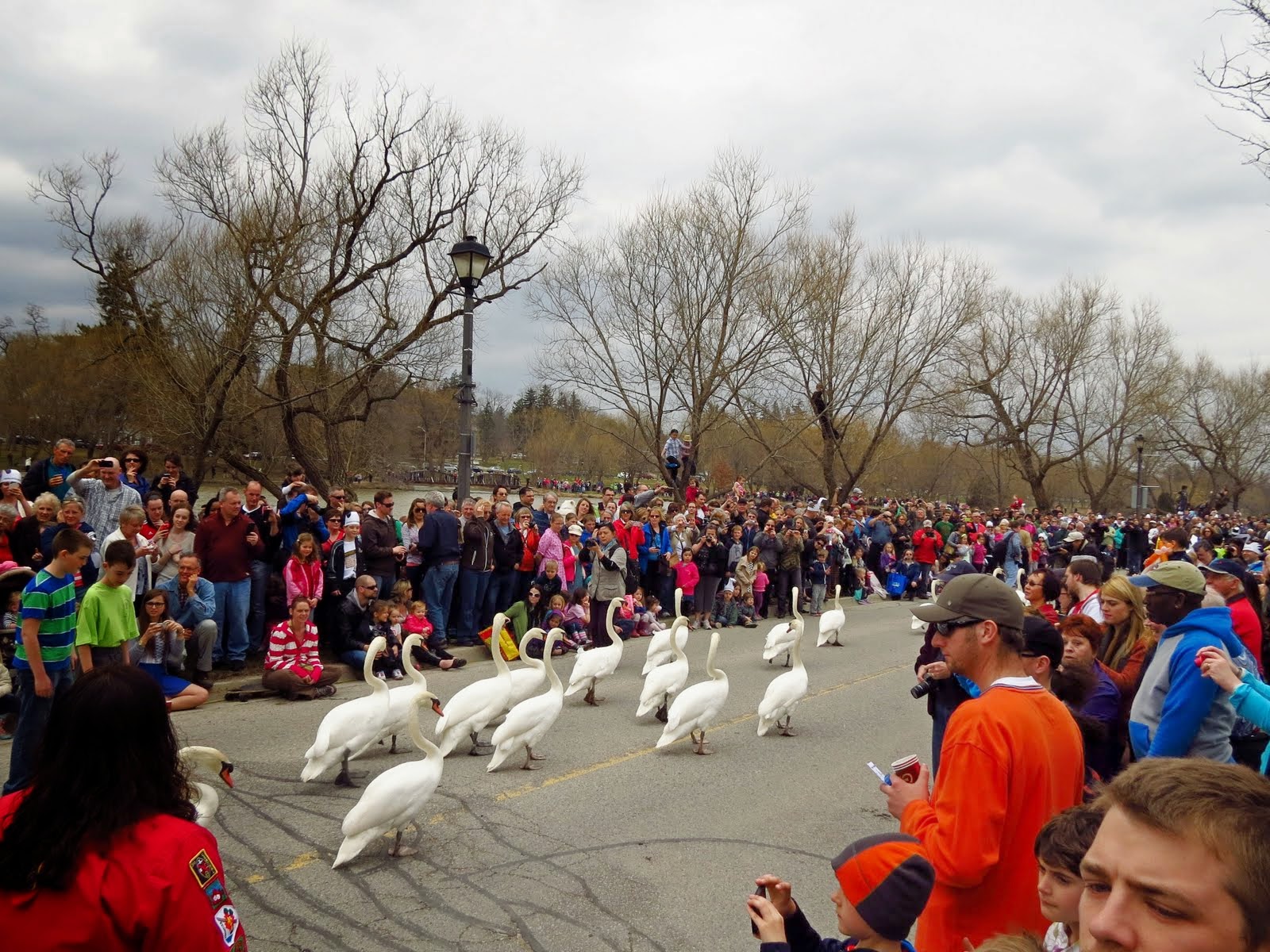 Оказывается лебедь является символом Стратфорда и вот уже 25 лет подряд здесь устраивают так называемый "праздник лебедей". Дело в том, что на реке Эйвон, в теплое время года, живут лебеди. На время зимовки их размещают в специальное помещение, и с приходом весны выпускают обратно на волю. И вроде бы все просто, ничего необычного в этом нет. Но то, с каким почетом в Стратфорде лебедей выпускают после зимовки, это что-то! Здесь в этот день устраивают настоящий праздник с музыкой, BBQ и различными развлечениями. Но самым главным событием, ради которого в Стратфорд съезжаются толпы народа, это парад лебедей.