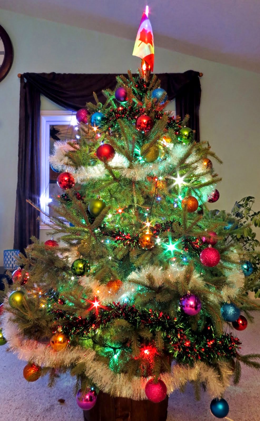 Мы никак не могли найти ничего подходящего на макушку... Чего только мы туда не примеряли... В итоге, канадский мигающий флажок показался нам очень интересным решением. К тому же, мы ведь совсем недавно стали канадцами, так что флажок на елке нам оказался очень даже в тему:-)