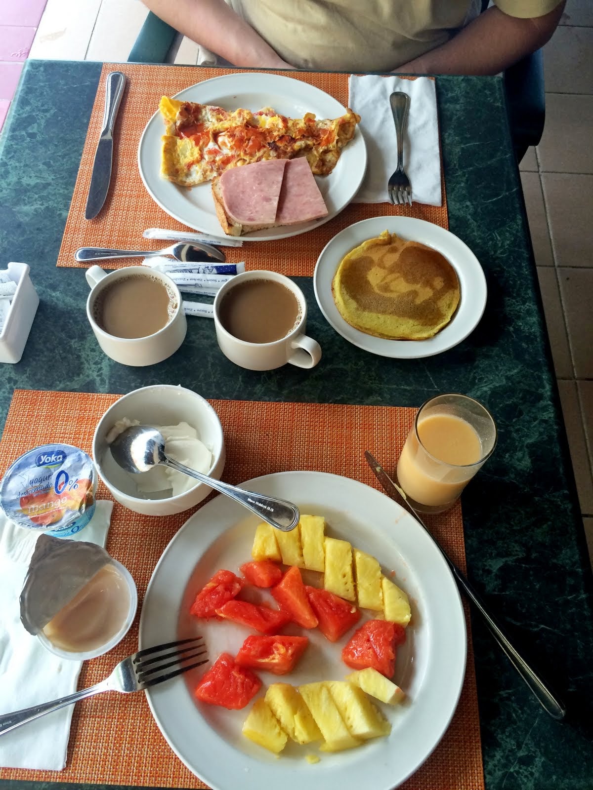 Кормили нас, кстати, очень вкусно и разнообразно. Вот так выглядел наш стандартный завтрак.