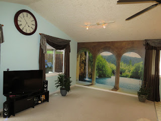 А фотообои мы наклеили просто, чтобы чем-то занять большую пустующую стену. И в итоге потом очень были этому рады. На фотке, к сожалению, не видно, что они создают такой объемный эффект, что прмо вот кажется можно нырнуть в это озеро через стену :D