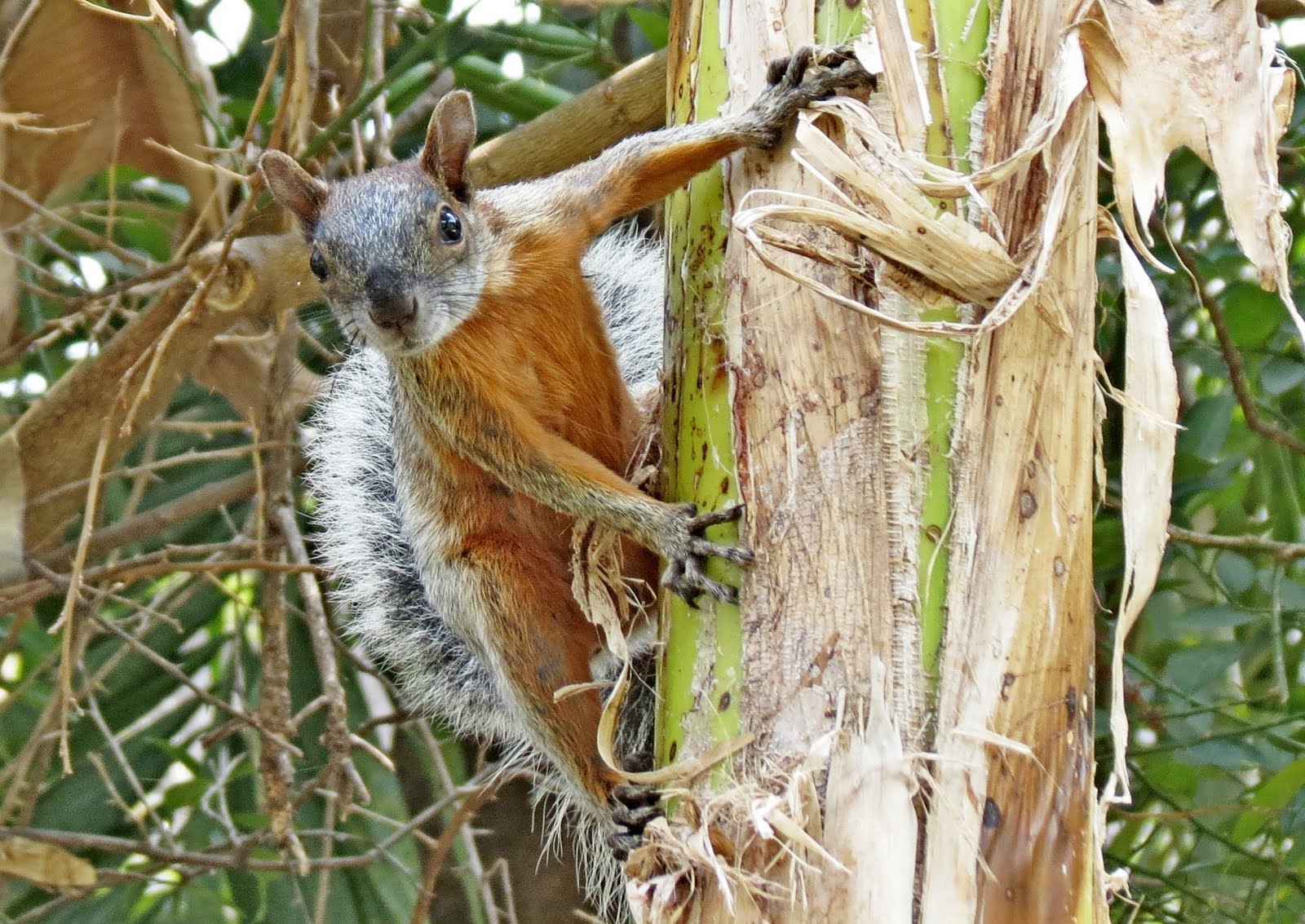Они периодически забирались с орехом на пальму и свешивались головой вниз, цепляясь задними лапами за ствол. Белки-акробаты, не иначе.
